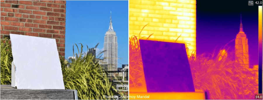 Summary: Passive Daytime Radiative Cooling is a process where an object under the sky reflects sunlight and radiates heat through the atmosphere into outer space. If an object has a sufficiently high solar reflectance and thermal emittance, solar heating is minimized and radiative heat emission into outer space is maximized. As a result, the object can achieve a net heat loss even under sunlight, and passively cool down to sub-ambient temperatures. Because this process is “zero-energy, zero-carbon”, it is a sustainable alternative to active cooling methods such as air conditioners, or an affordable cooling method in low-resource settings.